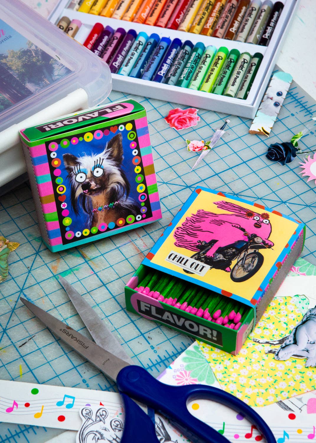 collage art box of matchsticks with 2 striker stickers boxes measure 3.25" x 3.25" x 1"