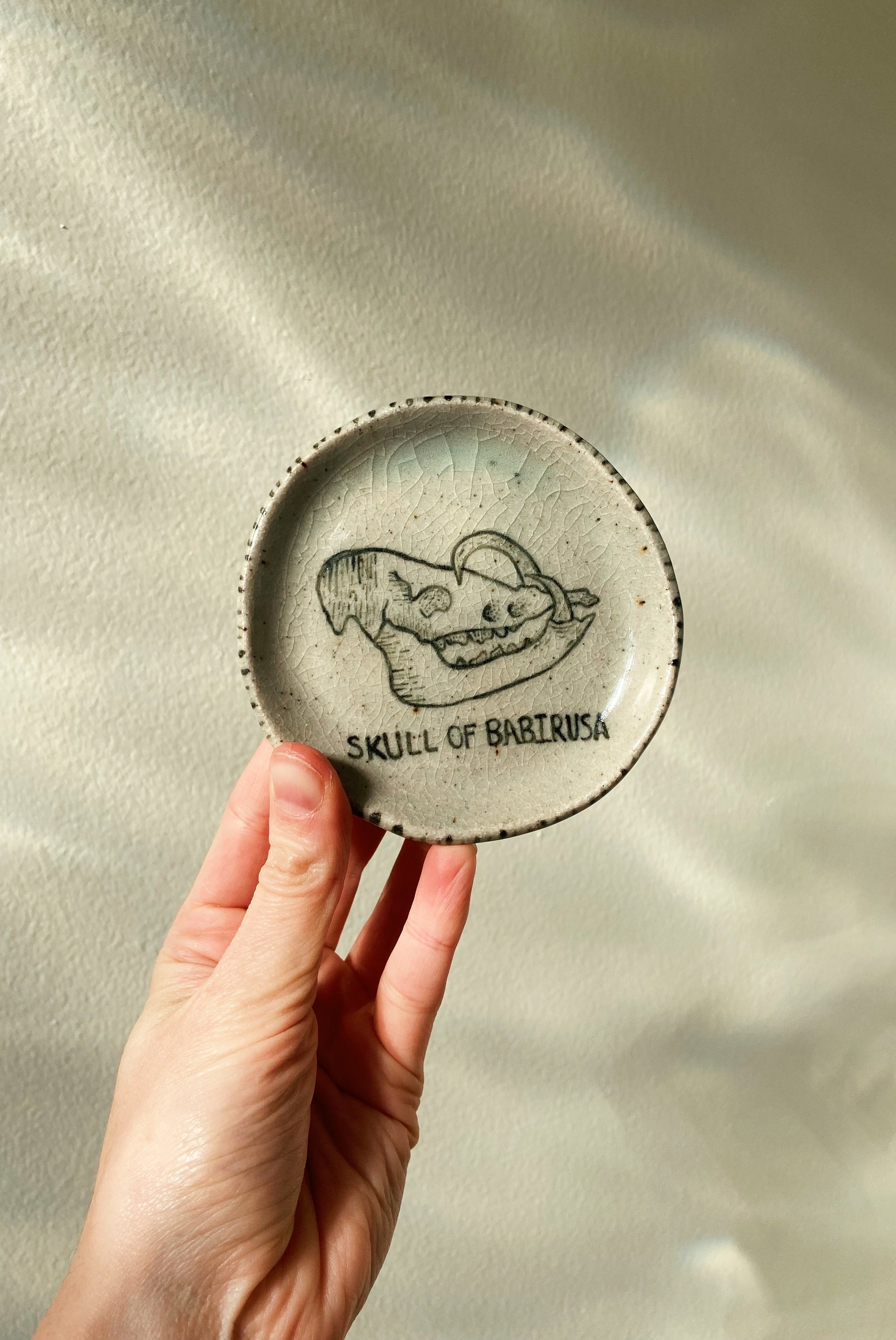 This is a handmade ceramic catch all dish depicting a babirusa skull. The skull is drawn in an anatomical style. Hand wash only. Approx 4.5" across.
